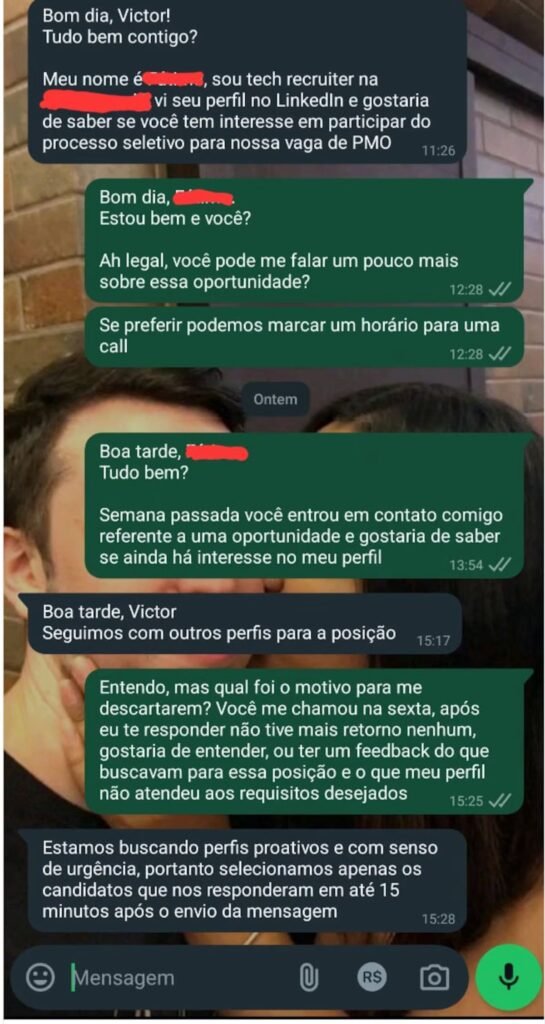 Barrios relatou que um recrutador entrou em contato pelo WhatsApp, às 11h26 do dia 28 de junho, para verificar seu interesse em uma vaga de gerente de projetos (PMO). No entanto, ele respondeu a mensagem uma hora e dois minutos depois, às 12h28. O recrutador justificou a eliminação dizendo que apenas consideraram candidatos que responderam em até 15 minutos.